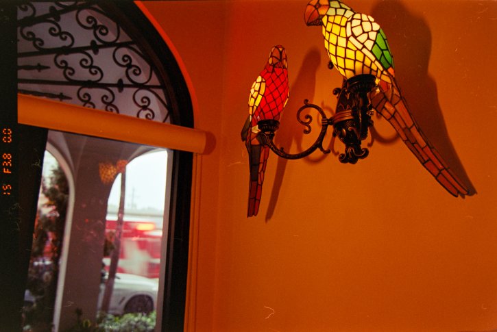 Tiffany style stained glass parrots chandeliers all over this place in Las Olas Fart Drunkerdale, I mean Fort Lauderdale Florida. Nikone F80s with Kodak Portra 400 film.