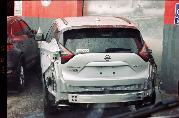 My Breaks Work Fine. How's your insurance? bumper stick on a wrecked Nissan Murano SV AWC photographed on the Nikon F80s with Kodak Vision3 250d movie film.