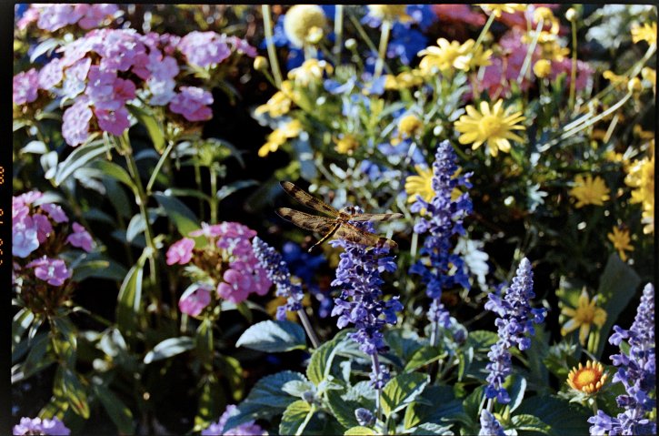 Dragonfly sitting on a purple flower surrounded by other colorful flowers. Shot on Kodak Ultramax 400 film on the Nikon F80s film camera.