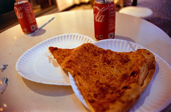 Huge pizza slice sitting on two paper plates and two Coca-Cola's ready to be enjoyed. Kodak Portra 400 film.