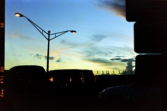 Crazy swirls clouds painted orange with e blue and yellow sunset. A massive gray mushroom cloud in the distance. Shot with the Nikone F6 with Kodak Portra 800 film.
