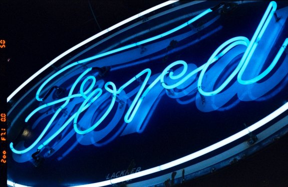 Neon Ford logo sign on Kodak Portra 800 film, shot on the Nikon F6.
