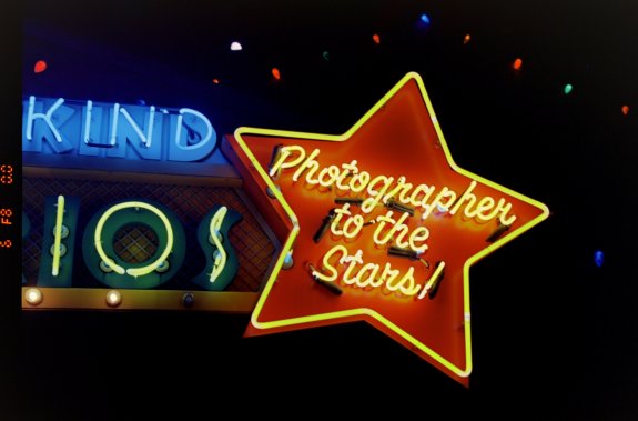 Photographer to the Stars neon sign on Kodak Ektar 100 film. Nikon F80s with the Nikkor 24–85mm G VR ED lens.