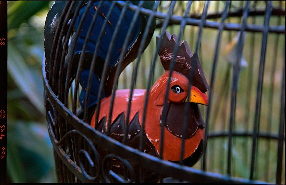 Lomography CN 800 film photo of a caged rooster.
