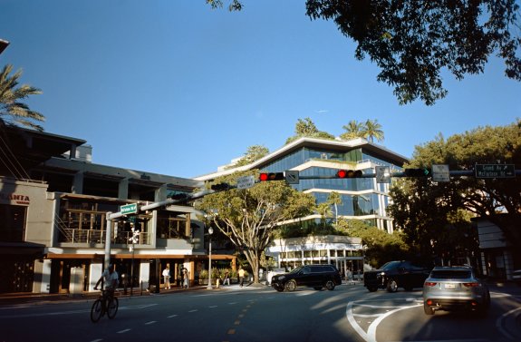 Sunset Place parking lot in the background, traffic light Long exposure of the intersection with a car passing. South Miami on film.