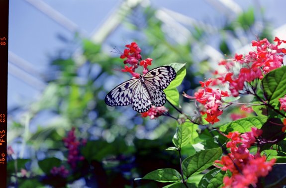 Black & white butterfly sits on a red flower. Shot on Nikon F6 w/ Kodak Ektar 100 film.
