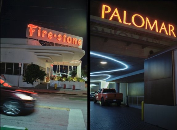 Retro neon Firestone gas station sign diptych with a modern Palomar Hotel neon sign. Miami Beach Lomo CN 100 film.